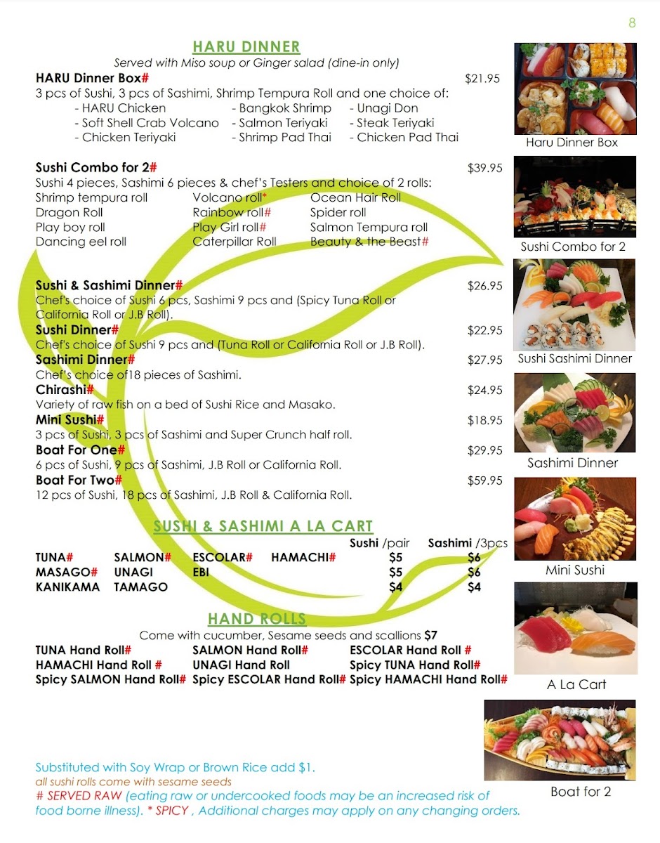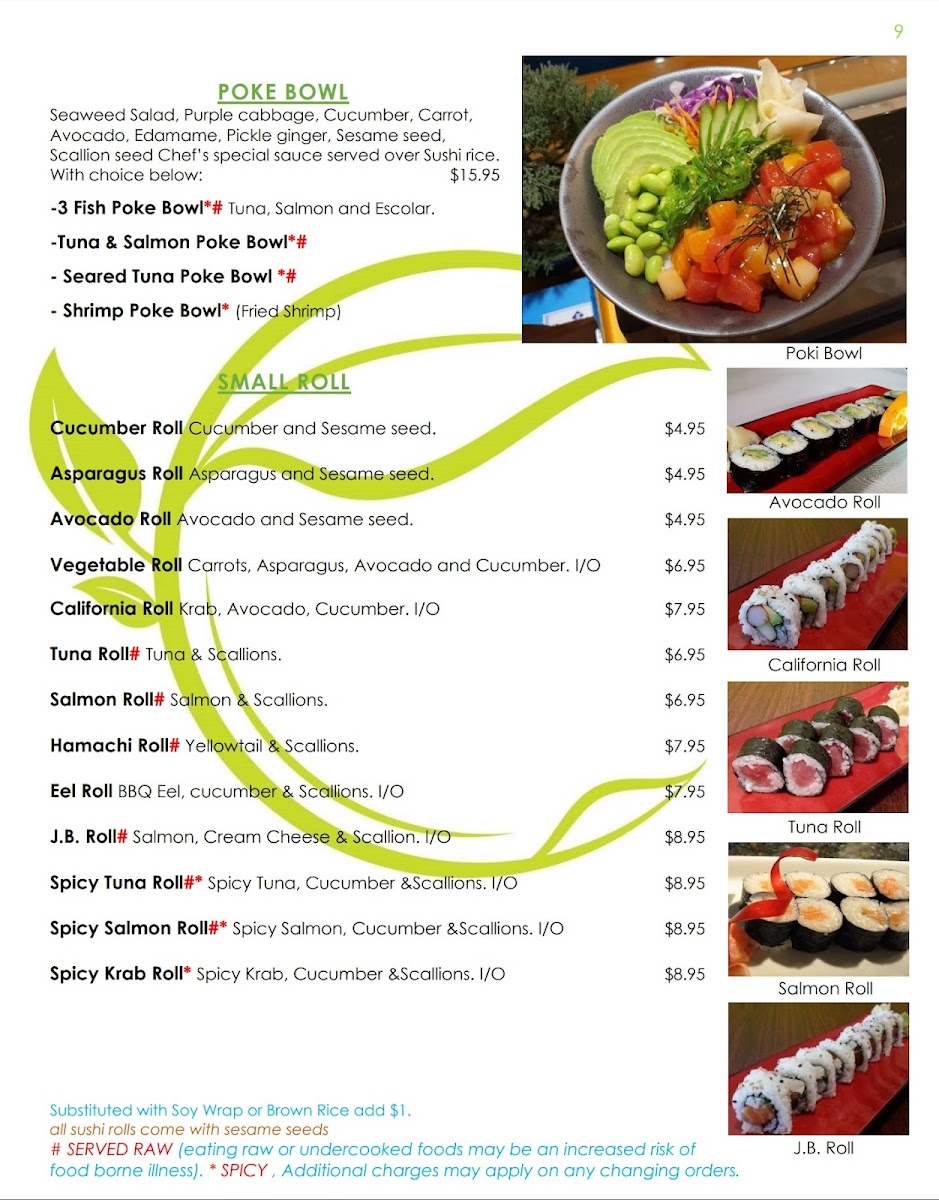 8 pieces of sushi, 12 pieces of sashimi, sashimi salad, California roll, and JB roll.