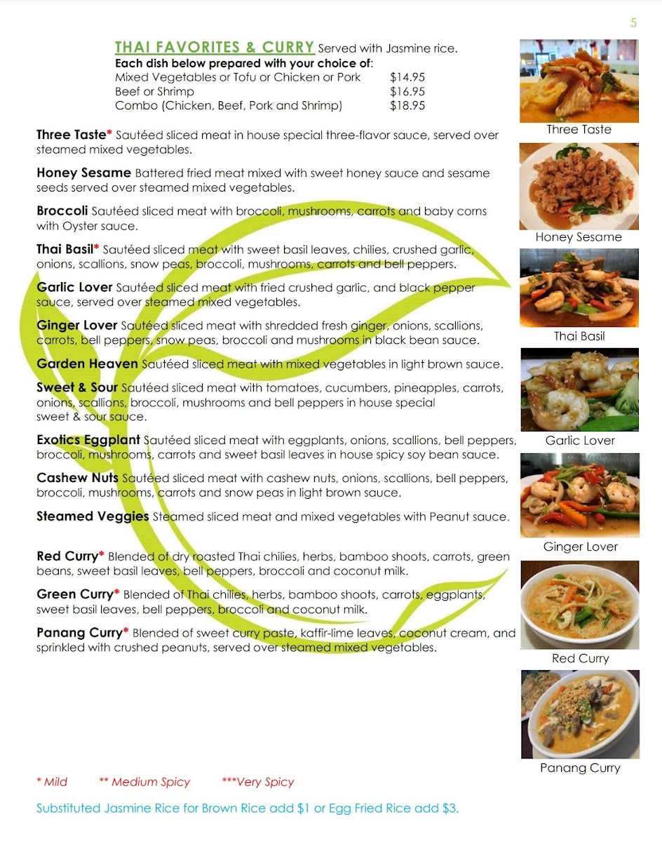 Thai coconut milk with panang curry paste, ground peanuts, snow pea, bell pepper, green bean, kaffir lime leaves.